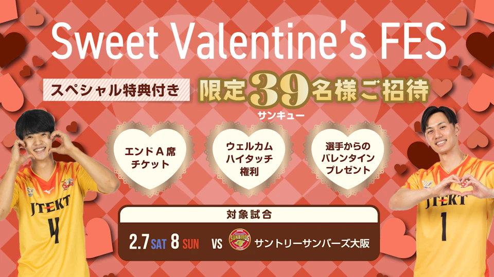 2月7日(土)・8日(日)、2025-26シーズン 大同生命SV.LEAGUE MEN 第13節(vs. サントリーサンバーズ大阪)の『Sweet Valentine’s FES』では、バレンタインデーにちなんでスイートなグルメFESを開催するほか、STINGSファミリーの皆さんへの愛をこめて、スペシャル企画を実施します!