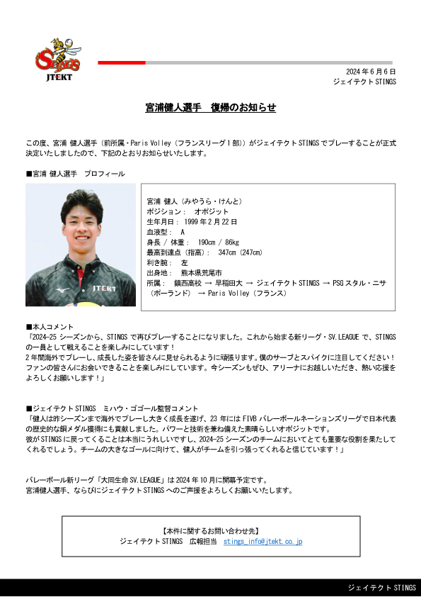 宮浦健人選手 復帰のお知らせ | ジェイテクトSTINGS愛知|男子バレーボールチーム
