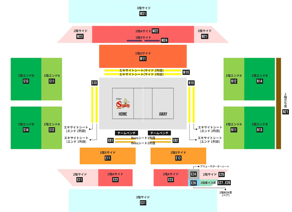 ※ Beesシートはチームベンチと同じ高さのため、コート内が見えにくい場合があります。