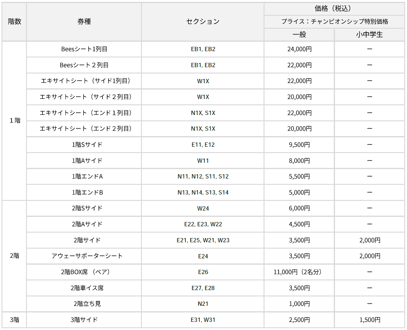 購入方法 | 購入枚数は、Beesシート・エキサイトシート・車イス席は1枚まで、1階SサイドおよびAサイドは2枚まで、その他の席種は4枚までとなります。 ・5月2日(土) GAME2 チケット購入はこちら ・5月3日(日) GAME3 チケット購入はこちら 『チケットV』のご利用にはアカウント登録が必要となりますので、予めご確認ください。 | |||
