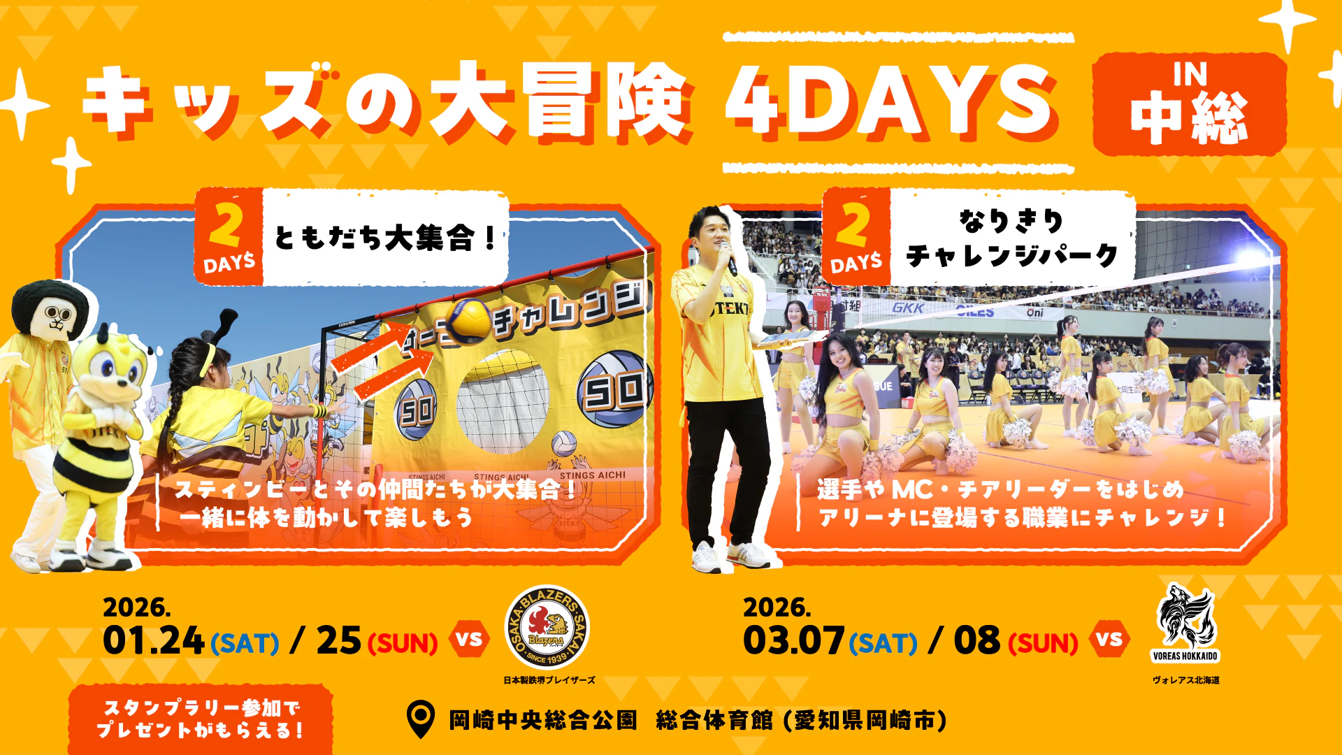 大同生命SV.LEAGUE MEN 12節(1月24日・25日)・16節(3月7日・8日)、岡崎中央総合公園にて開催予定のジェイテクトSTINGS愛知ホームゲームで、『キッズ大冒険 4Days』を開催いたします。