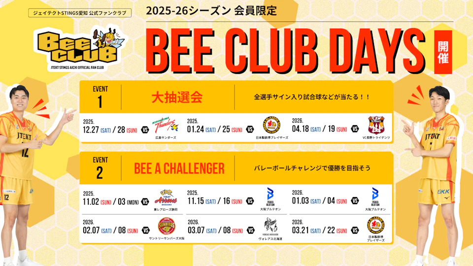 2025-26 大同生命SV.LEAGUE MEN レギュラーシーズンにて、公式ファンクラブ『BEE CLUB』会員の皆さまを対象にスペシャル企画をご用意する『BEE CLUB DAYS』を開催します。