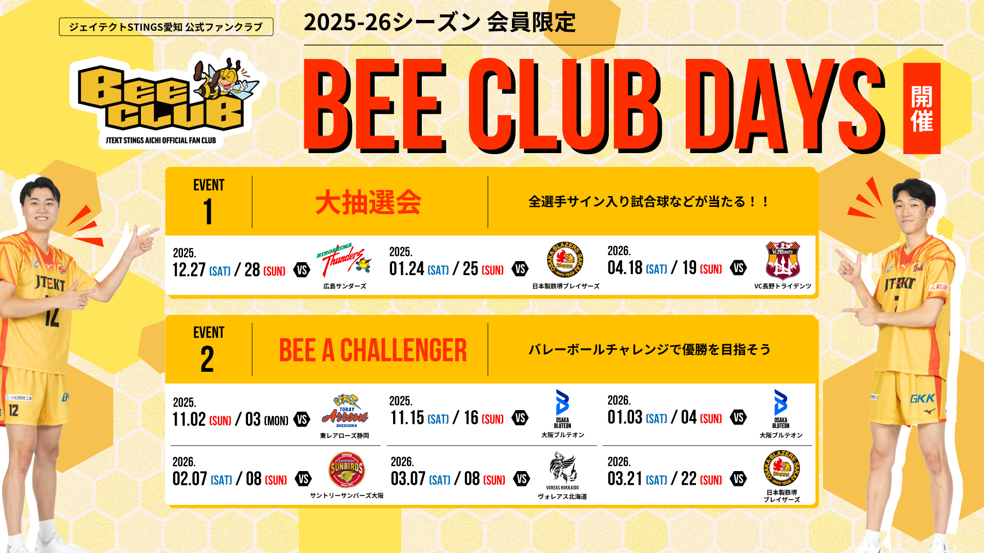 2025-26 大同生命SV.LEAGUE MEN レギュラーシーズンにて、公式ファンクラブ『BEE CLUB』会員の皆さまを対象にスペシャル企画をご用意する『BEE CLUB DAYS』を開催します。