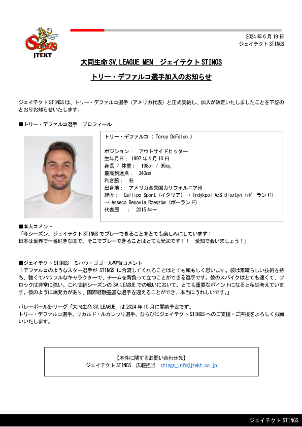 大同生命 SV.LEAGUE MEN ジェイテクト STINGS トリー・デファルコ選手加入のお知らせ