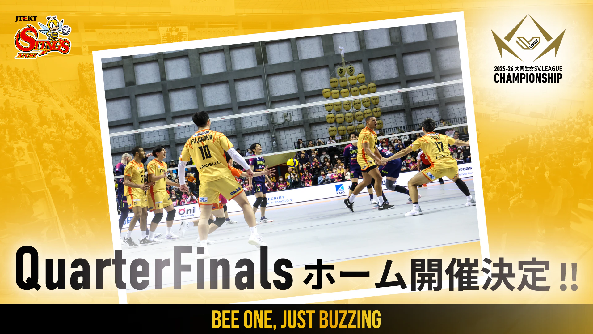 本日4月5日(日)に行われた2025-26 大同生命SV.LEAGUE MEN レギュラーシーズン第20節 GAME2の試合結果に伴い、ジェイテクトSTINGS愛知のチャンピオンシップ クォーターファイナル ホーム開催が決定いたしました。
