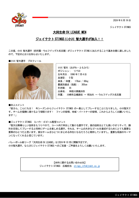 大同生命SV.LEAGUE MEN ジェイテクトSTINGS に小川 智大選手が加入!!