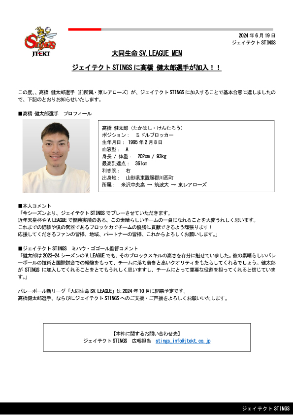 大同生命SV.LEAGUE MEN ジェイテクトSTINGS に髙橋 健太郎選手が加入!!