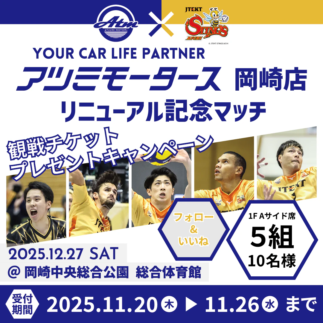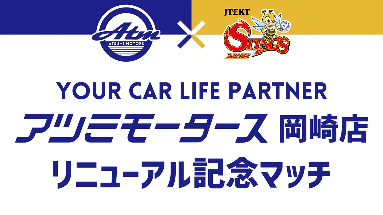12月27日(土)に岡崎中央総合公園 総合体育館(愛知県岡崎市)にて行われる2025-26 大同生命 SV.LEAGUE MEN レギュラーシーズン 第8節 GAME1 広島サンダーズ戦を株式会社渥美モータース協賛による『アツミモータース 岡崎店 リニューアル記念マッチ』として開催いたします。