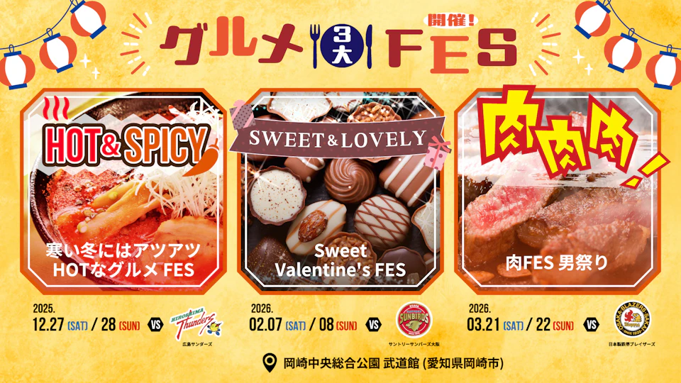 大同生命SV.LEAGUE MEN レギュラーシーズン第8節(12月27日・28日)・13節(2月7日・8日)・18節(3月21日・22日)、岡崎中央総合公園にて開催予定のジェイテクトSTINGS愛知ホームゲームで『3大グルメFES』を開催いたします。